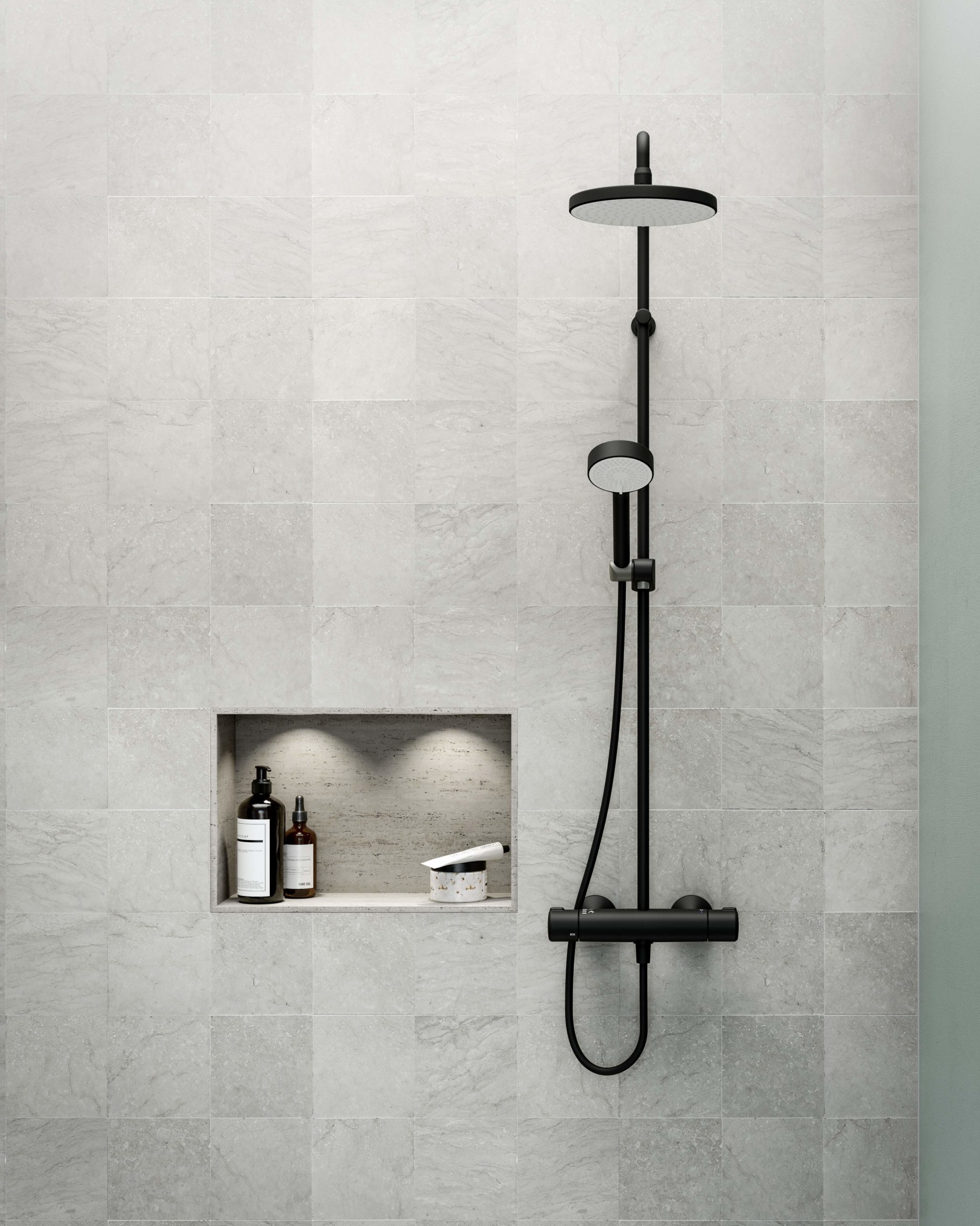 HANSA Matt Black Duschsystem: Waschtisch, Wanne, Dusche: Im Bad zieht sich der edle Farbton durch alle Bereiche. Hier: das HANSAMICRA Duschsystem. (Foto: Hansa Armaturen GmbH)